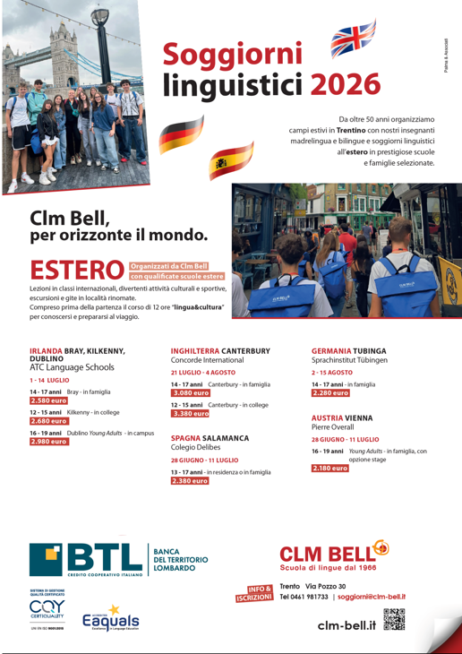 Tale partnership consente alla Banca di proporre a condizioni agevolate ai figli di Soci BTL in età scolare un programma di campus estivi in lingua estera, in Italia (situati in Trentino) e all’estero per l’estate 2026.
