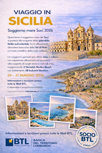 Sarà il villaggio VeraClub Modica Beach in Sicilia la destinazione del Soggiorno Mare 2026 riservato ai Soci dal 24 maggio al 31 maggio 2026. Info e modalità di iscrizione presso tutte le filiali BTL.